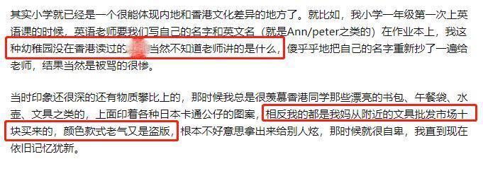 网友回忆,他小学一年级第一次上英语课的时候,老师让每一位同学写下自己的中文名和英文名,而他这种“幼稚园没在香港读过的”,不知道老师所谓的英文名是指什么,导致没能完成任务被老师批评。