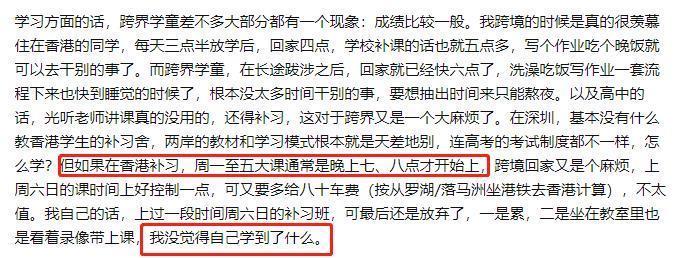 这位网友自称是最早一批跨境学童,父亲是中国香港人,2006年读小学,每天从家门口乘坐保姆车到罗湖口岸去香港上学,放学再回家。对于他来说,到香港就读似乎并不是一件特别令人开心的事情。
